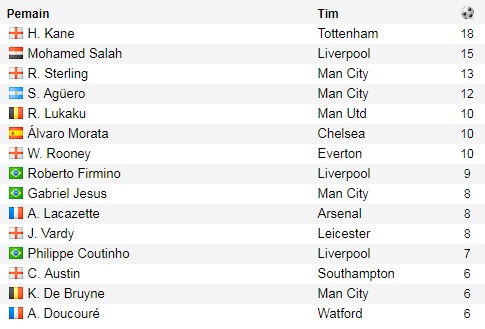 Daftar Top Skor Liga Inggris 2017 2018