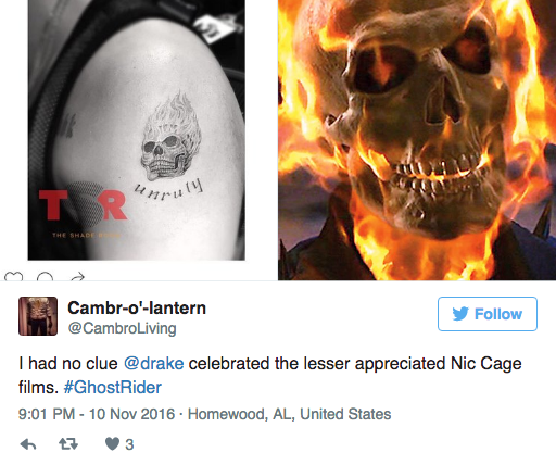 Drake Got A Nicolas Cage Inspired Ghost Rider Tattoo And The Internet Can T Stop Teasing Him Failbook Failing On Facebook