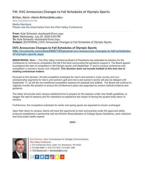 Ovc Announces Changes To Fall Sports Schedules Sports Easternprogress Com