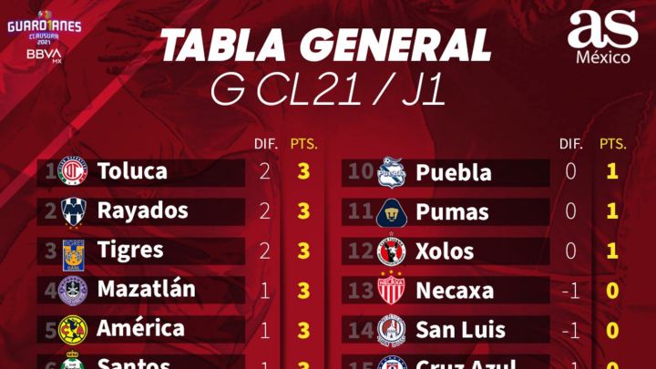 Tabla General De La Liga Mx Guardianes 2021 Jornada 1 As Mexico