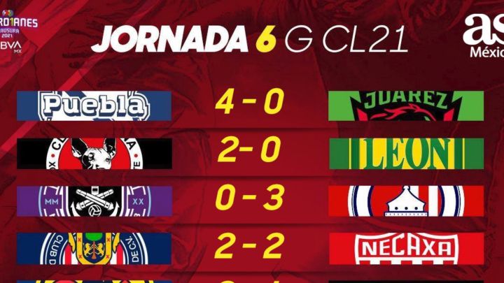 Resultados de la jornada 6 del torneo de la liga mx guardianes 2021 que empezo con el partido entre puebla y juarez el dia viernes y termino con el partido e.